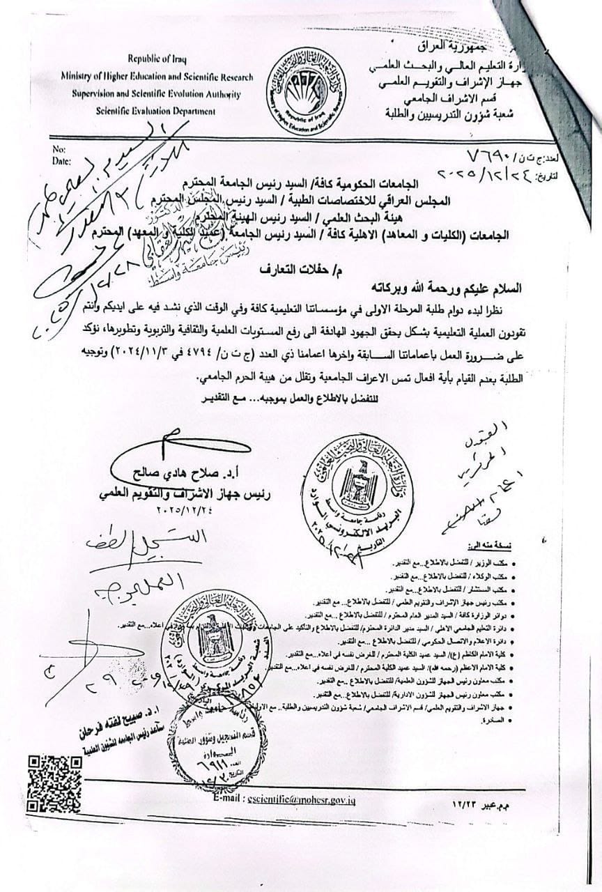 بالوثيقة.. تؤكد وزارة التعليم على أهمية التزام طلبة المرحلة الأولى بالأعراف والتقاليد الجامعية، وضرورة الامتناع عن أي تصرفات قد تمس بهيبة الحرم الجامعي خلال حفلات التعارف.